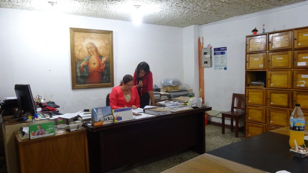 A Zapatoca, il existe en tout six secrétariats, pour un total de 47 personnes employées par l’administration municipale : un secrétariat des affaires publiques qui traite de toutes les questions juridiques et affaires générales de la commune, un secrétariat de développement social, un secrétariat du trésor et du logement, un de la planification (ou aménagement public), un secrétariat du contrôle interne et un autre, unité des services publics et domestiques, qui s’occupe de l’entretien de la ville. Il s’agit par conséquent d’une organisation bien différente de la nôtre, bien qu’on y retrouve tous les services municipaux tels que nous les connaissons. Seulement, chaque Secrétaire se retrouve avec beaucoup de dossiers à gérer en même temps, et le peu d’employés municipaux ne permet pas de déléguer les tâches. Ainsi, pour un œil externe, il semble difficile de s’y retrouver et le suivi semble désorganisé. Or, le fait que les postes clés ne soient pas occupés par des techniciens nous donne à voir un certain sens de l’engagement communautaire, d’autant plus que les salaires ne sont pas élevés comparés à des postes dans le privé.